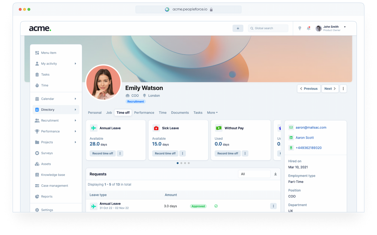 Cada empleado puede ver el directorio de los miembros del equipo, el calendario con los próximos eventos, los OKRs, los objetivos y en un solo clic, solicitar baja por enfermedad o vacaciones.